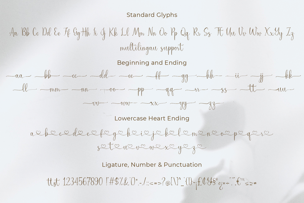 This gorgeous font includes all lowercase and uppercase characters, numbers, punctuation, an array of standard ligatures and a selection of international characters as well.