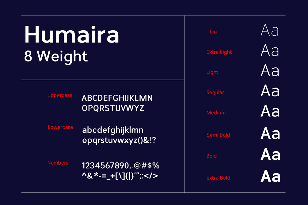 - Eight Versatile Weights: From Thin to Extra Bold, Humaira provides the perfect weight for every design need.