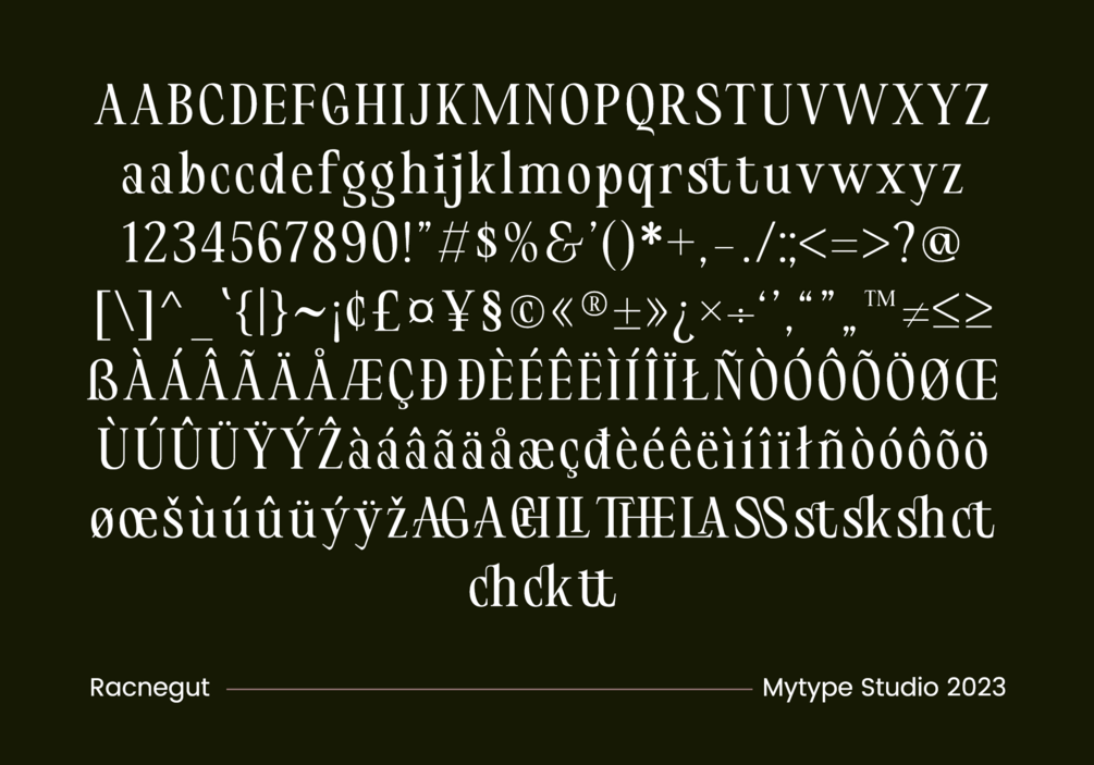 Professional Quality: With its robust set of OpenType features and carefully crafted ligatures, Racnegut offers professional-quality typography that enhances the visual appeal of your projects.